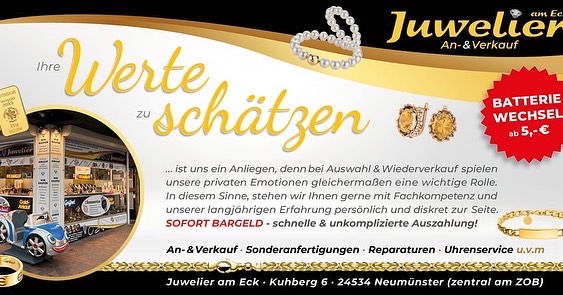 Profitieren Sie vom hohen Goldkurs! Garantiert werden eine seriöse Wert-Ermittlung in diskreter Atmosphäre mit sofortiger Barauszahlung. Angenommen werden Altgold, Bruchgold, defektes Gold, Antik-Schmuck, Barrengold, Goldmünzen sowie Zahngold (auch mit Zähnen), egal ob alt oder ungereinigt. Auch Nobel-/Luxusuhren wie z.B. Rolex, Breitling, Patek usw. werden angenommen sowie Diamanten/Brillanten.